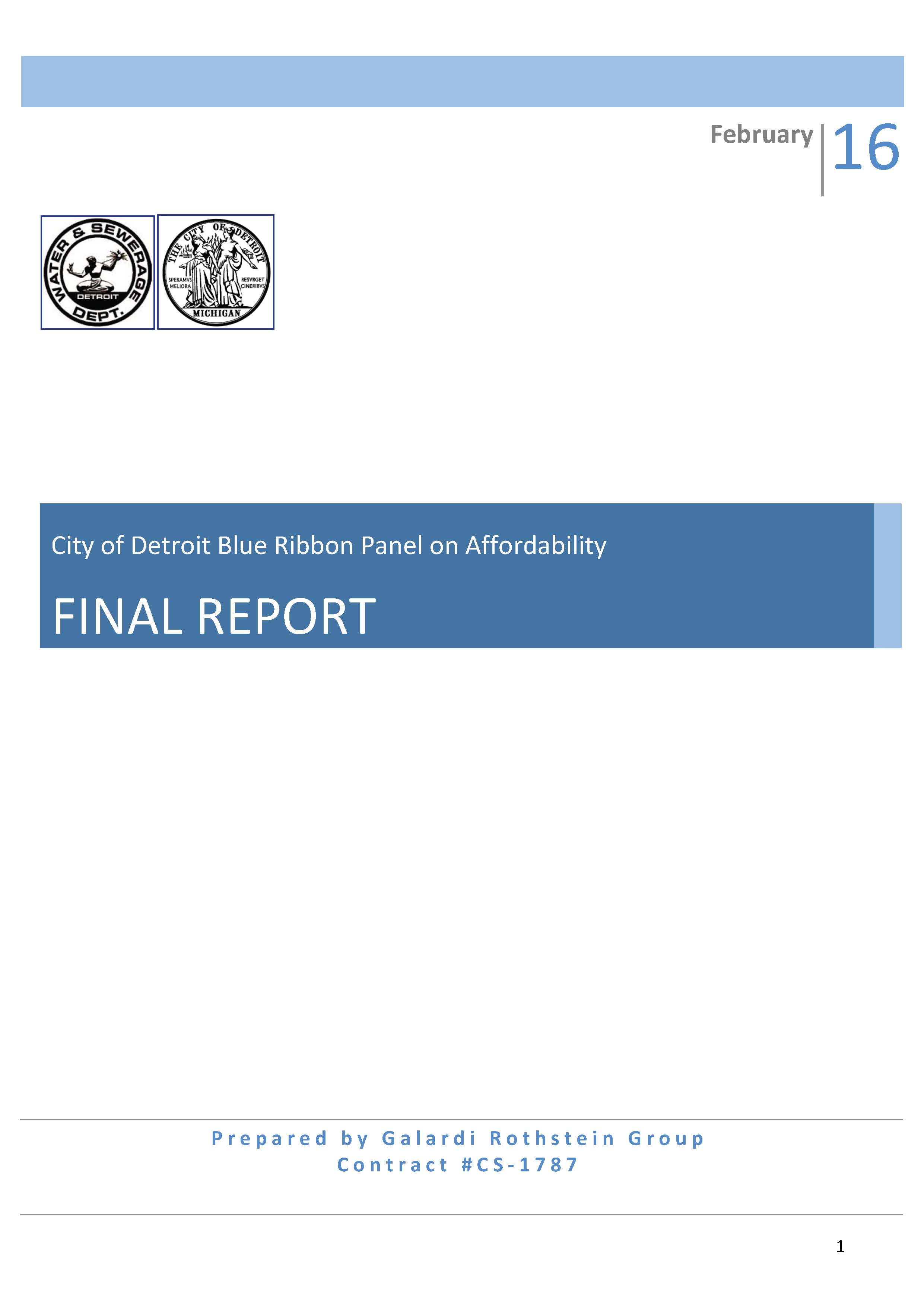 In October 2015, the City of Detroit convened the Blue Ribbon Panel on Affordability (BRPA), composed of national experts and local stakeholders, to collectively identify and evaluate options to address low‐income customers’ challenges in paying water and sewer bills and the subsequent service disconnections. The panel met four times between October 2015 and December 2015.